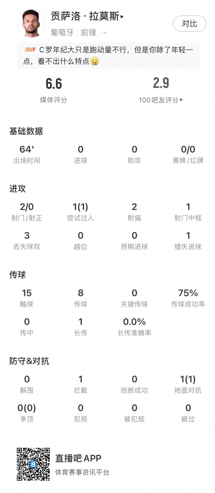 03月29日讯 友谊赛葡萄牙客场0-0平墨西哥,贡萨洛·拉莫斯首发64分钟被换下场,本场2次射门1次中框,1次错失进球。